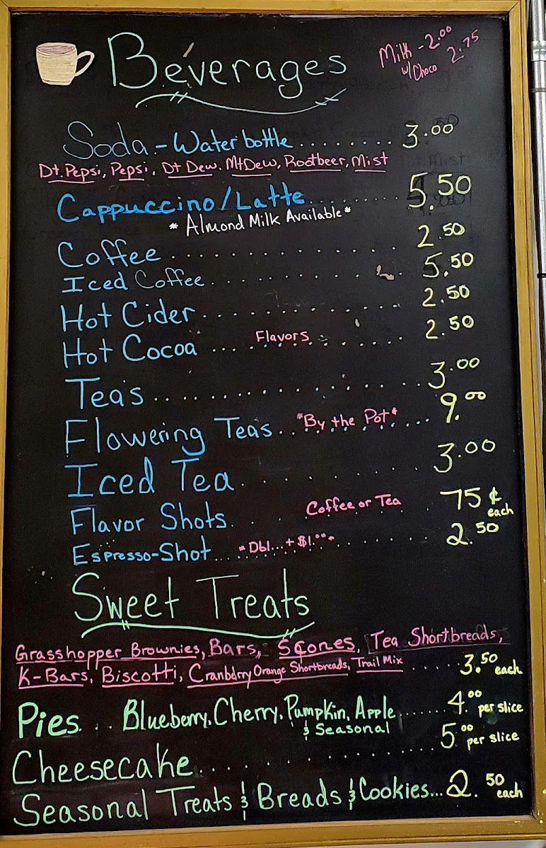 Beverages: The drinks menu includes a range of hot and cold options such as cappuccino, coffee, iced coffee, hot cider, hot cocoa, flowering teas, and iced tea. Prices for several beverages start at around US$2.50 to US$3.00, catering to those seeking a coffee house or tea house experience.