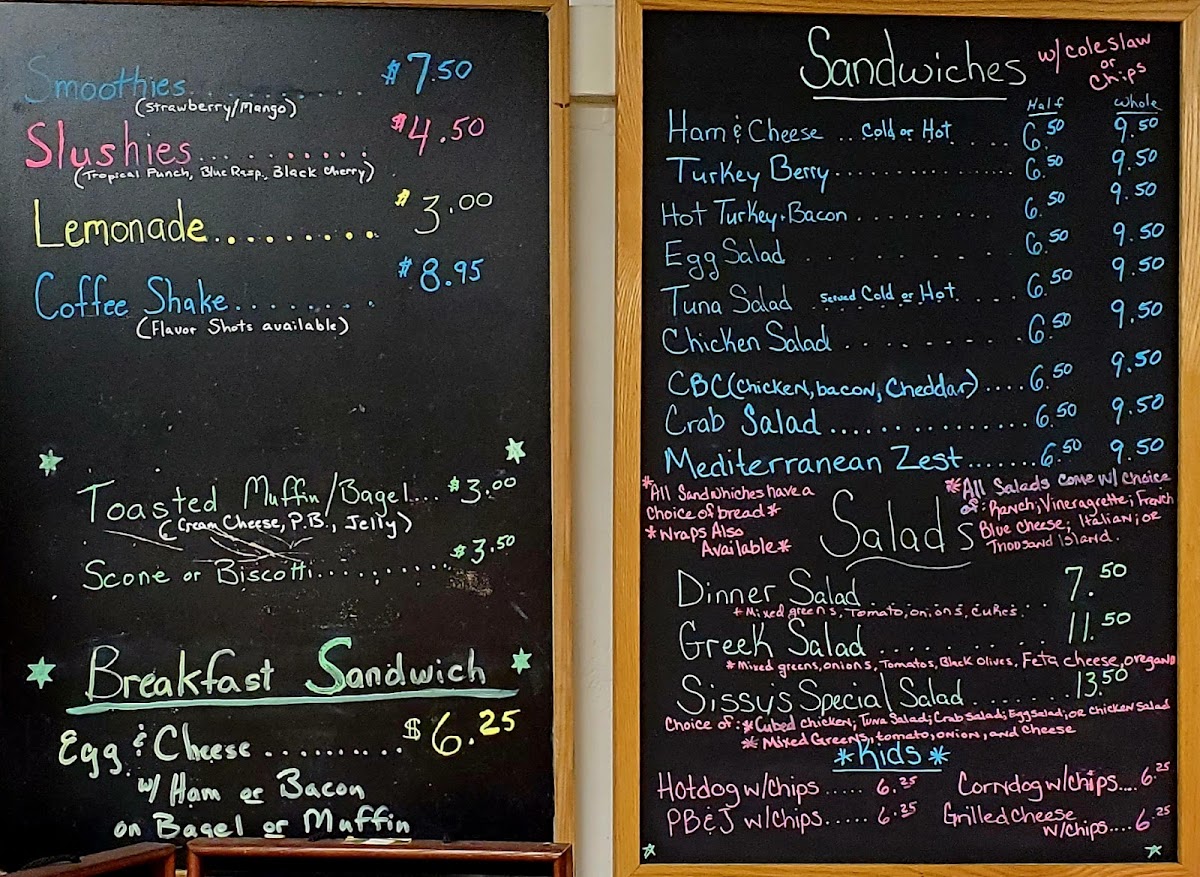 The menu at Sissy's Treats & Treasures offers a variety of options suitable for breakfast, lunch, and casual coffee breaks. The selection is organized into several groups to accommodate different dining preferences.